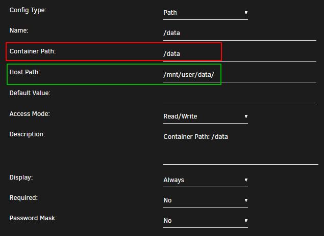 Host Path: => The actual/absolute path used on your unRAID Server (The Host).