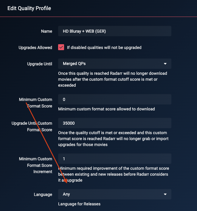 GermanorGerman DLversion is released, it will upgrade to that version. - The downloaded media will be upgraded to any of the added Custom Formats until the defined Score defined in the Quality Profile under